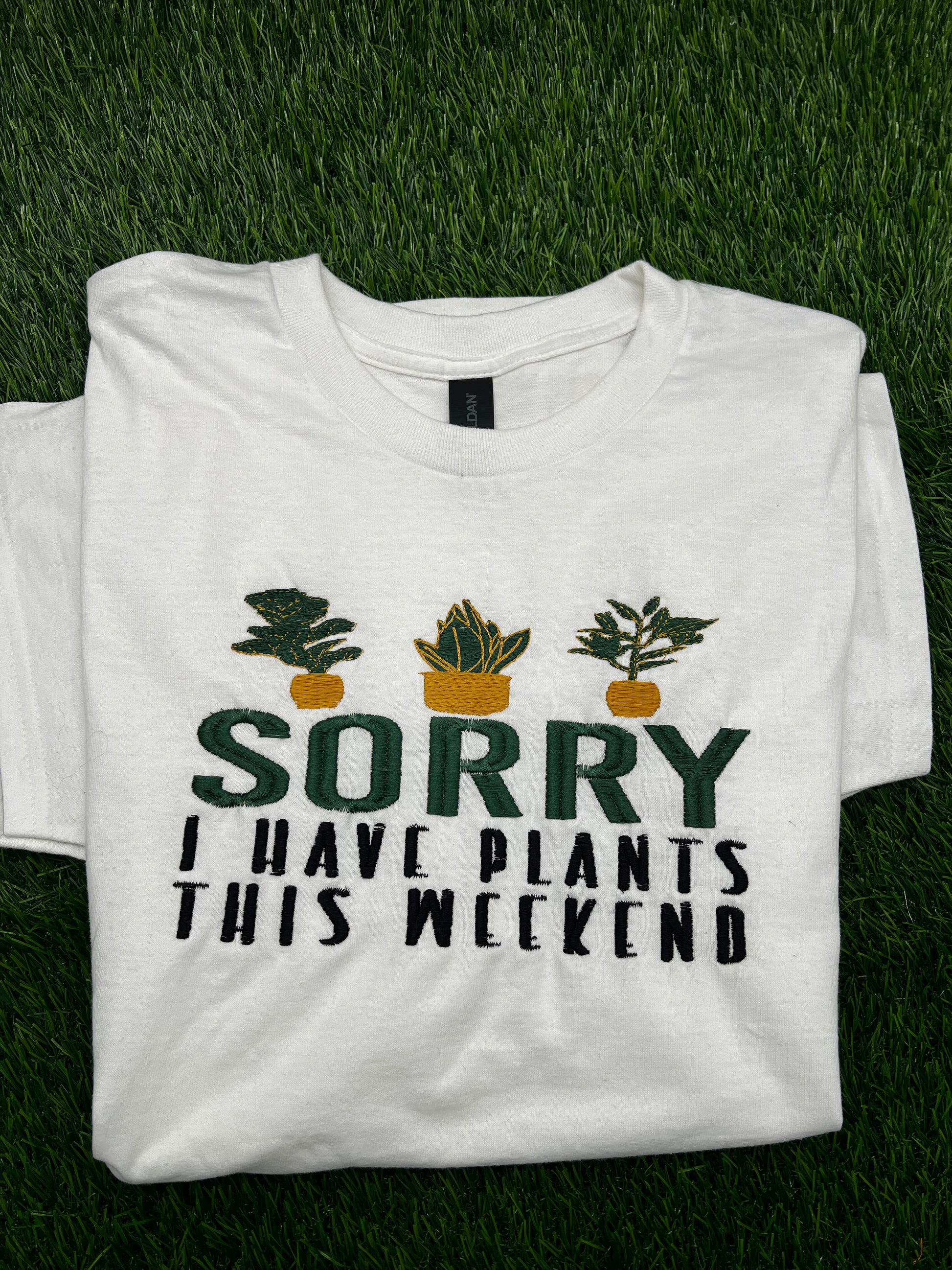 The “Sorry, I Have Plants This Weekend” embroidered tee is designed for plant lovers, houseplant parents, and anyone who finds peace in caring for their greenery. Featuring detailed embroidered plant designs and bold text, this shirt celebrates plant life, self-care, and choosing calm over chaos.